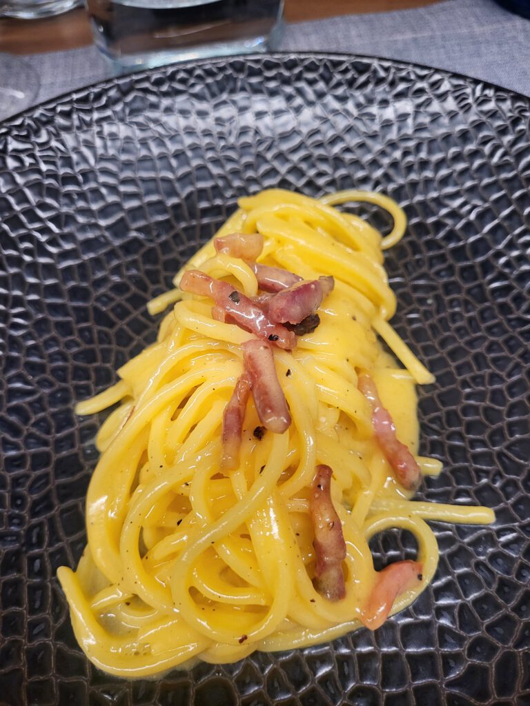 La propuesta sigue girando en torno a la cocina italiana auténtica, bien ejecutada y sin artificios innecesarios. Un claro ejemplo es su pasta carbonara, fiel a la receta romana original. En las imágenes se aprecia esa textura cremosa y brillante que solo se consigue con yema de huevo, queso y guanciale, sin nata. Un plato equilibrado, intenso y honesto, como debe ser.
