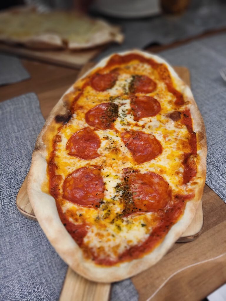Las pizzas artesanales son otro de los grandes pilares de la casa. Elaboradas con masas bien trabajadas y una fermentación cuidada, llegan a la mesa con una base ligera y crujiente. Destacan opciones como la pizza de pepperoni, sabrosa y bien integrada, o las pizzas de quesos, donde el fundido cremoso se realza con un toque de aceite de oliva.